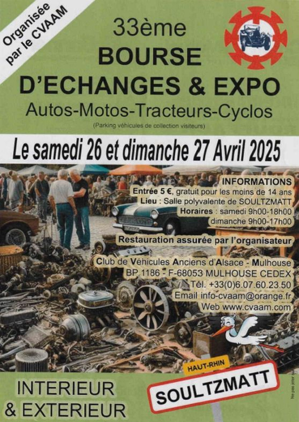 Du 26-04-2025 au 27-04-2025 à Salle Polyvalente, Soultzmatt (68), France  Organisateur: Club De Véhicules Anciens D'Alsace Mulhouse (CVAAM)