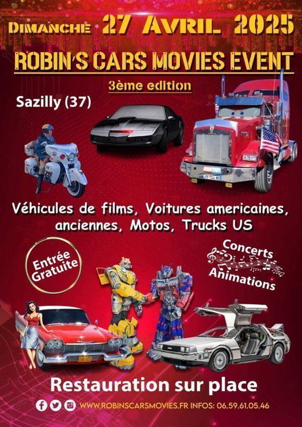 Rassemblement annuel de véhicules de films et de véhicules anciens Robin's Cars Movies organise la 3ème édition du Robin's Cars Movies Event le dimanche 27 avril 2025 à Sazilly (37). Ce rassemblement réunit des véhicules mythiques de films, des voitures américaines, des véhicules anciens, des motos et des camions US. Diverses animations comprenant des concerts. Restauration sur place. Entrée gratuite.