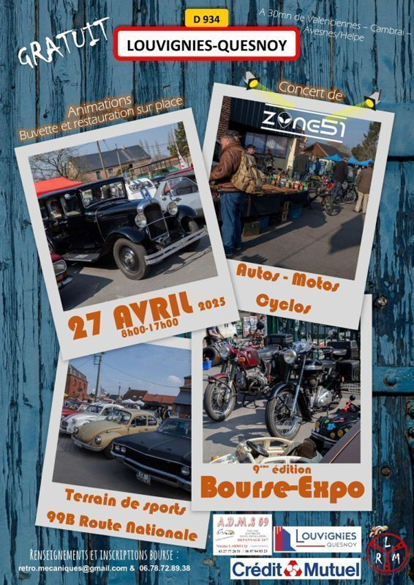 Bourse et exposition de voitures annuelle L'association Louvignies Rétro Mécaniques organise la 8ème édition de sa bourse-expo le dimanche 27 avril 2025 dès 08h00 au Stade Christian Lesne à Louvignies-Quesnoy (59). Cette bourse d'échanges annuelle propose des pièces détachées et différents objets liés à l'univers mécanique. L'exposition est réservée aux véhicules anciens : autos, motos et cyclos. Diverses animations dont concert, jeux pour les enfants, Petite restauration et buvette sur place. Emplacement gratuit pour les boursiers. Entrée et exposition gratuite pour les véhicules.